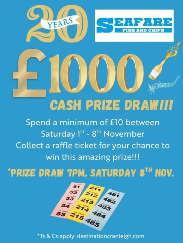 Happy 20th Birthday to Seafare fish and chips cranleigh 🎉To celebrate and to thank you for your amazing support, Seafare Cranleigh are giving away a £1,000 CASH PRIZE*!