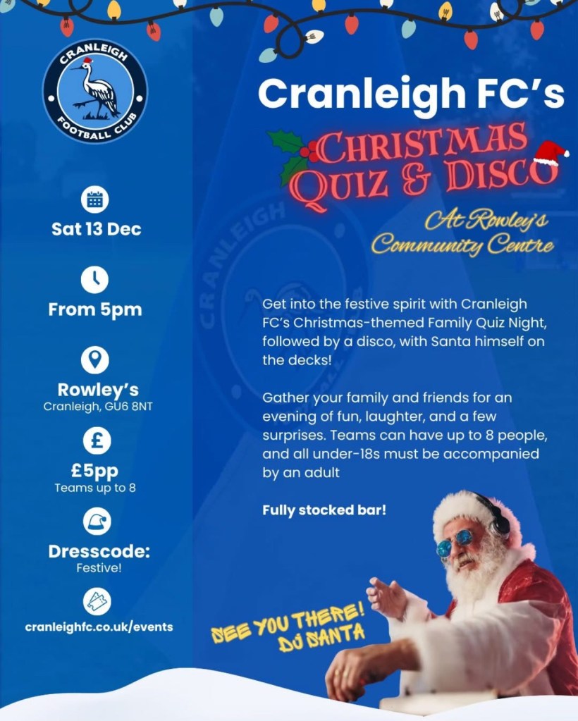 Get into the festive spirit with Cranleigh FC’s Christmas-themed Family Quiz Night, followed by a disco, with Santa himself on the decks!