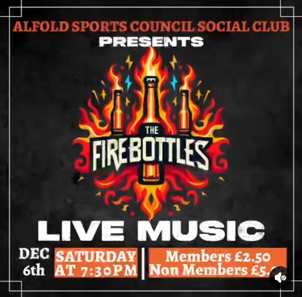 At Alfold Sports Council Social Club we have the fantastic fire bottle coming back to join us on the 6th December all non members £5.00 and all members £2.50 you can pay before the evening or on the door this will be a fantastic evening not to be missed 😀