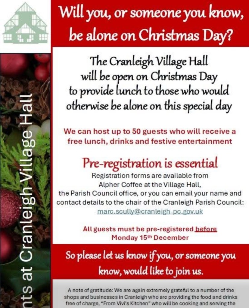 Will you, or someone you know be alone in Cranleigh on Christmas Day? The Village Hall will be open to provide a lunch and entertainment – pre-registration required. Collect a form from Alpher Coffee Cranleigh Village Hall.